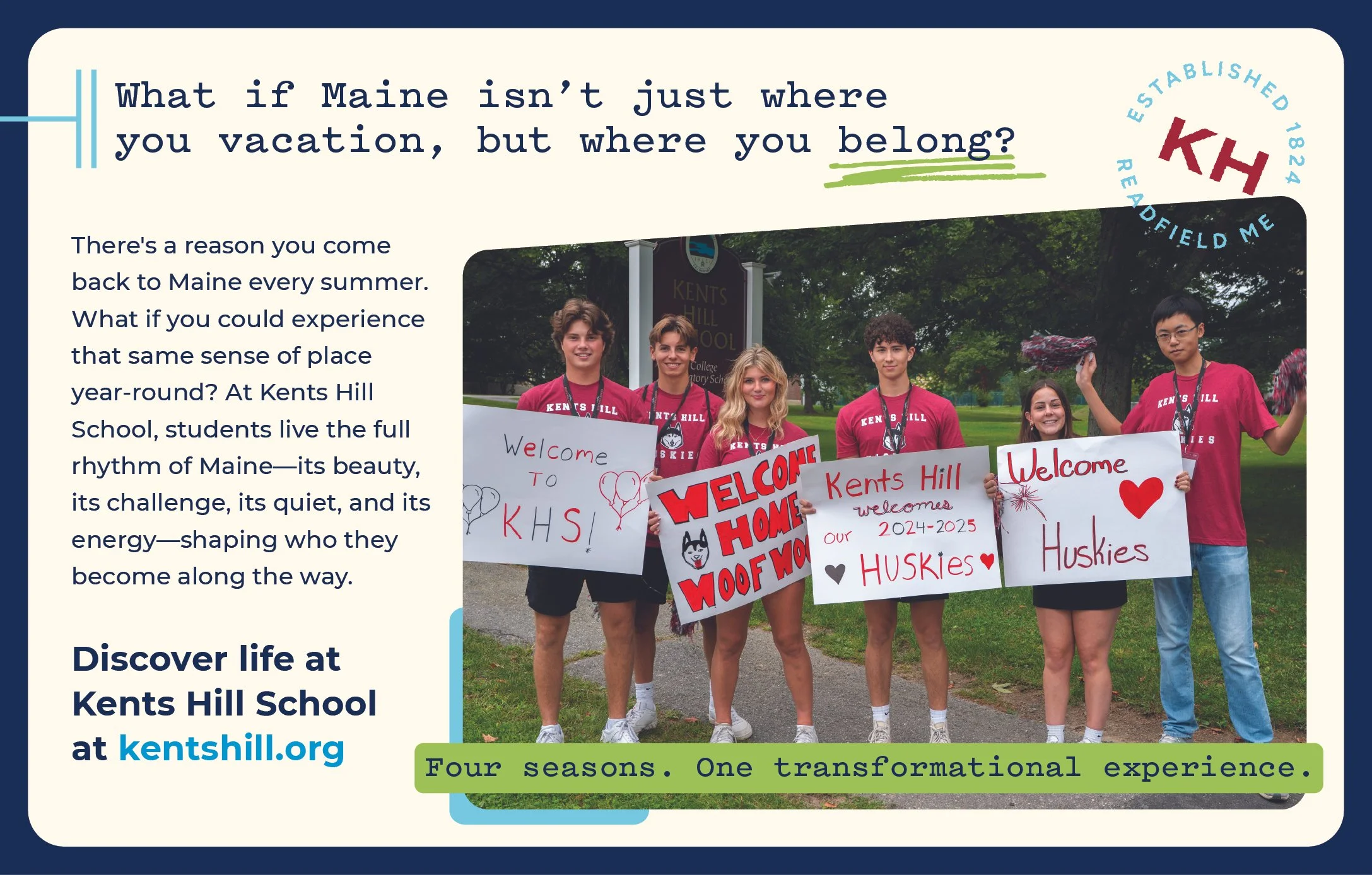 The work in this portfolio reflects that range: from larger brand pieces like the Bicentennial logo, viewbook, and core values video, to targeted campaigns like giving appeals, advertising, and admissions materials, as well as social content, photography, and web design. Across each project, my focus is on thoughtful, creative storytelling that captures the spirit of Kents Hill and helps people connect with the community in a genuine way.